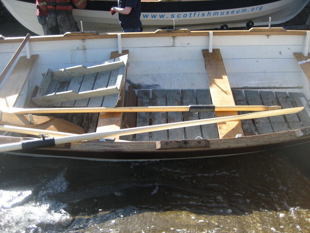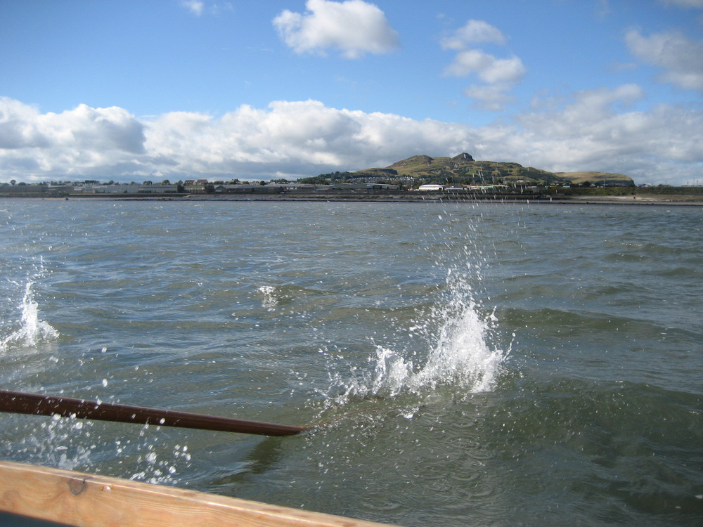 She set off rowing from Portobello beach in the the morning, but the wind got up and by the time they reached Granton the head wind was just too strong to row against. Telephone calls were made and the trailer brought from Portobello and the journey continued by road.