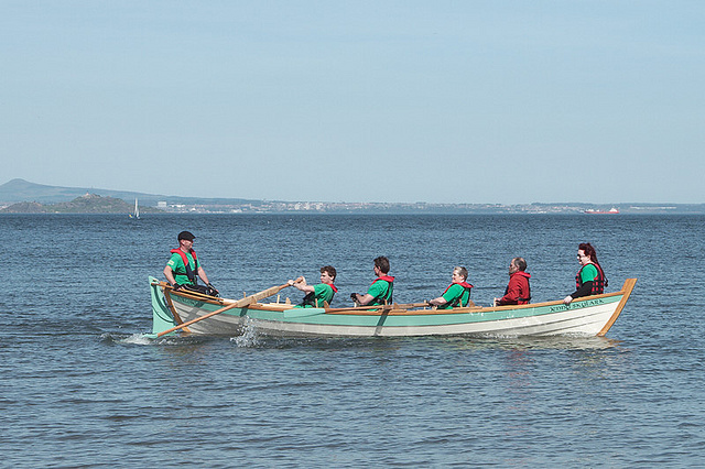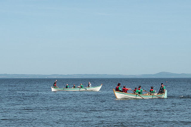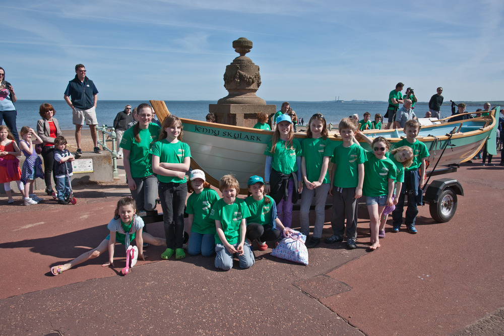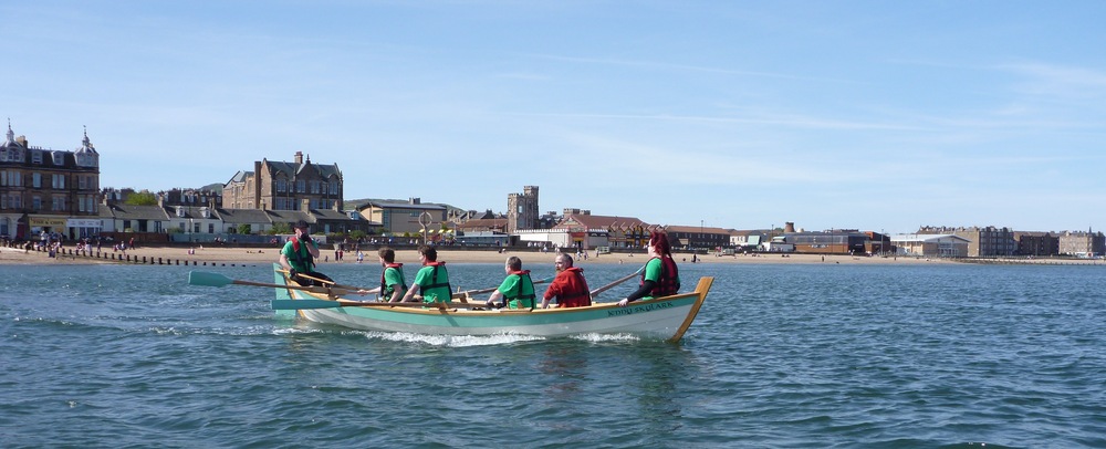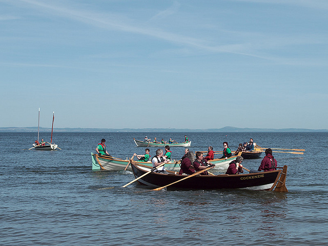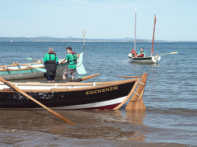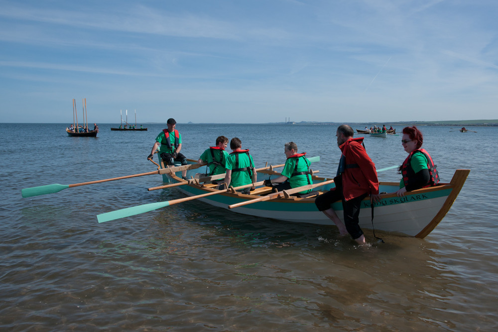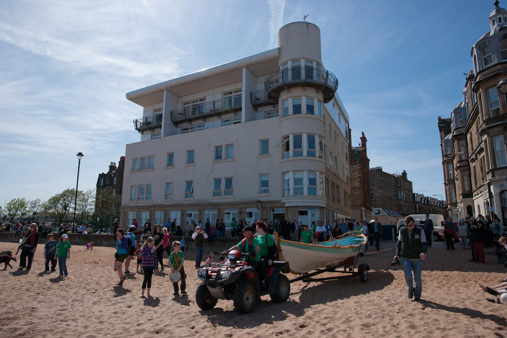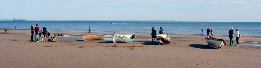 Early Sunday morning, 17th April: boats waiting on the beach before the excitement begins. From left to right: the 1920 Jolly Boat recently donated to Portobello by the Broughty Ferry Rowing Club; Icebreaker, our first boat; Boatie Blest and Boatie Rows, from Cockenzie/Port Seton. Image (c) Max Blinkhorn