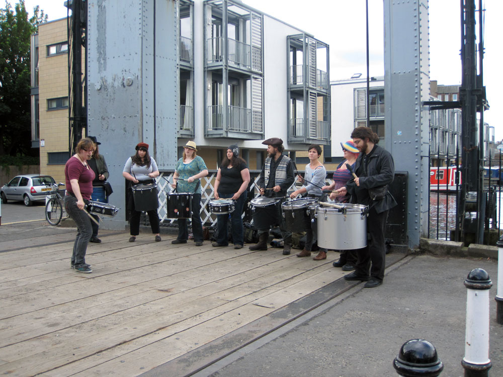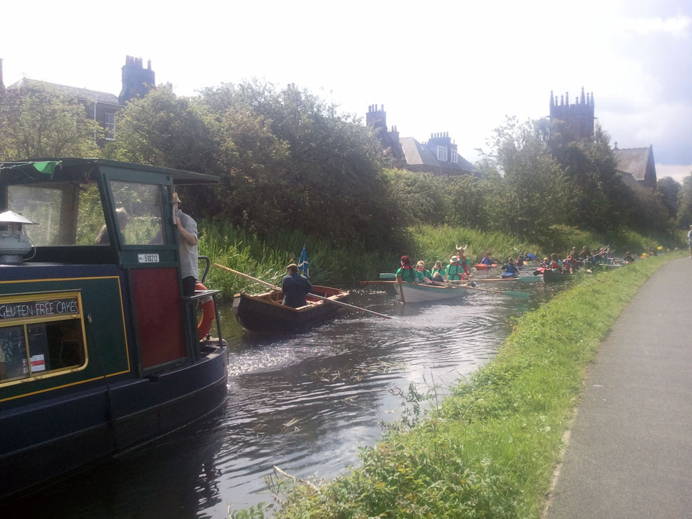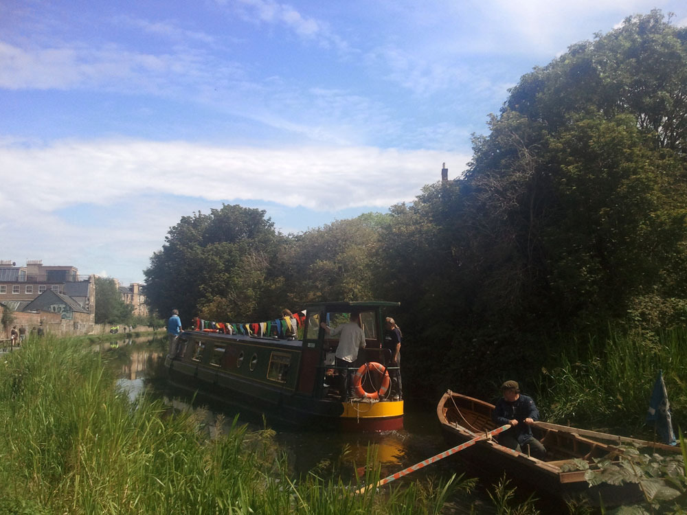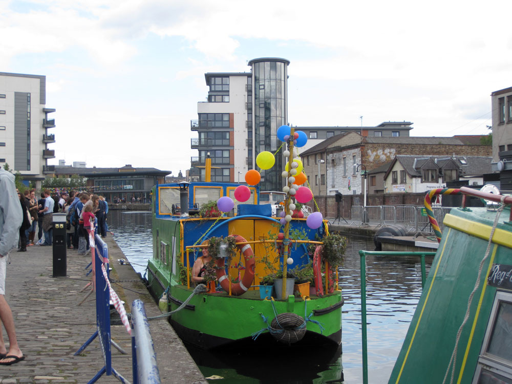 The festivities kicked off a around 11 with a parade, led by Zazou, a floating café, with a piper aboard, followed by Stan in his curragh, then Jenny Skylark & a flotilla of canoes / small craft. We crept along at the slowest of paces, occasionally having to ship oars as the canal narrowed under bridges.