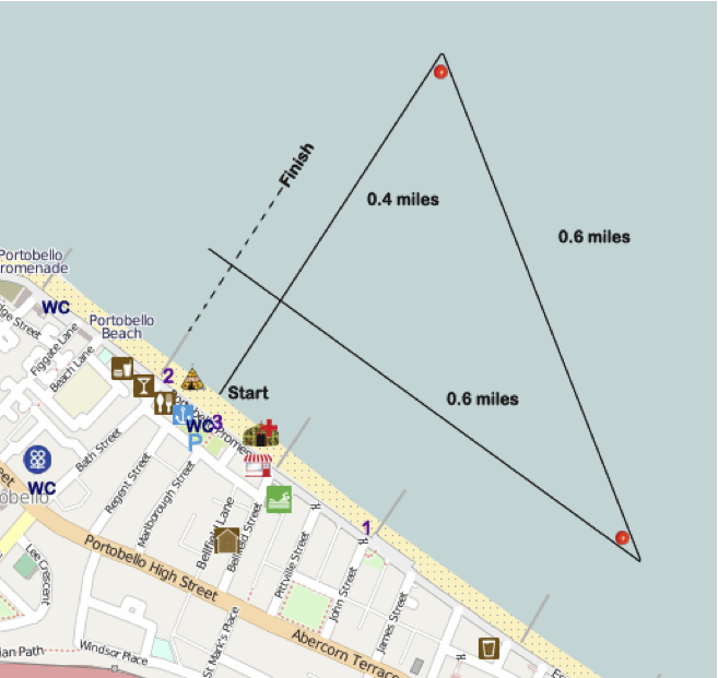 We have a massed start from the beach between Bath Street and Bellfield Street and head out towards a bouy on the horizon. The boats turn around the bouy and head towards Joppa.