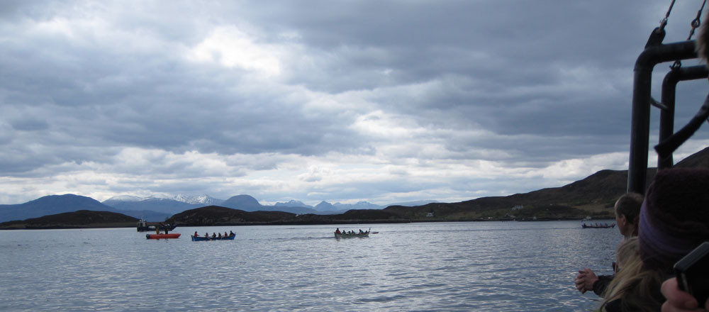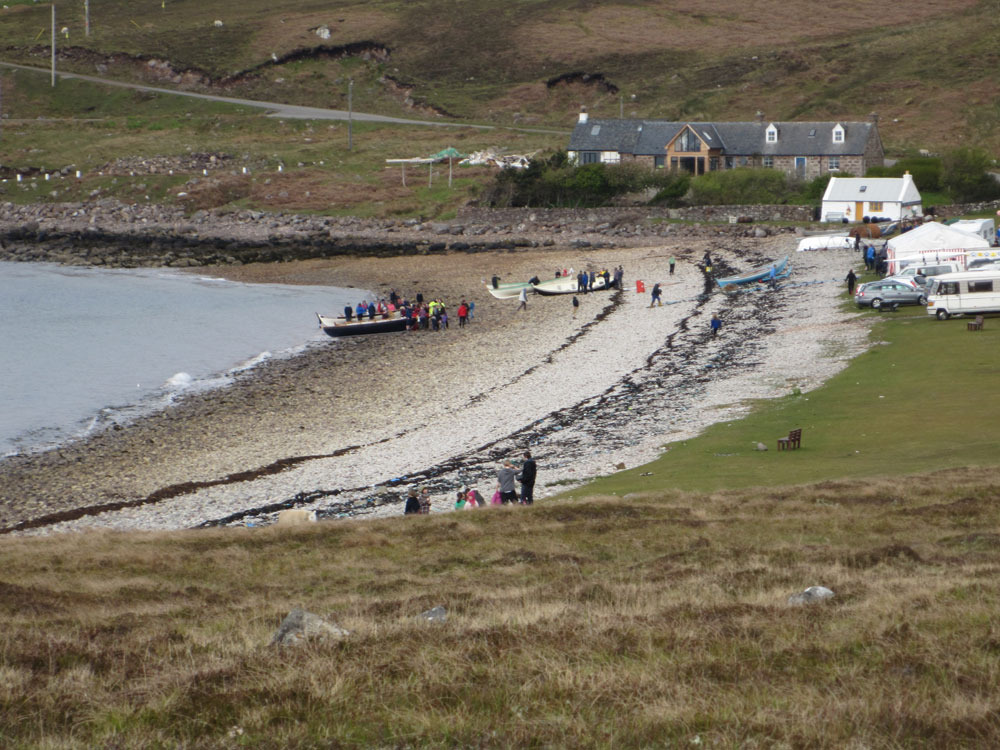 On Sunday, there was a race across to Tanera (Summer Isles), with Achiltibuie winning by a comfortable margin, (see above), the prize being a champagne breakfast. Rowporty came second against stiff opposition from North Berwick. Other skiffs made a leisurely row to Tanera, including Icebreaker. Those who didn’t row, were taken across to Tanera on a boat (not sure what sort of boat it was but it looked as if it had been there almost as long as the mountains, it carried 30 folk at a time & made at least 4 trips there & back)